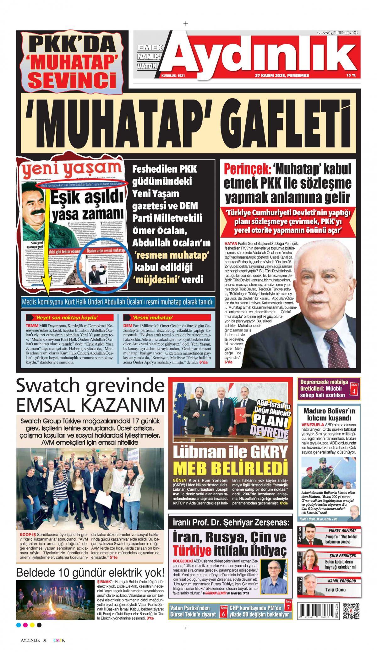 Aydınlık Gazetesi 28 Kasım 2025 Günü Manşeti