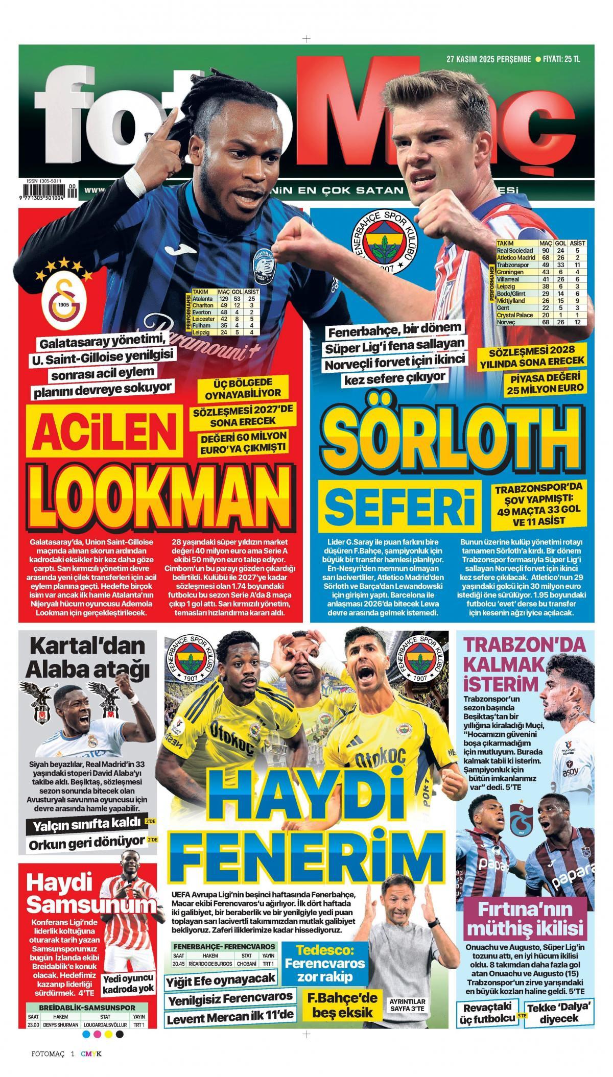 Fotomaç Gazetesi 28 Kasım 2025 Günü Manşeti