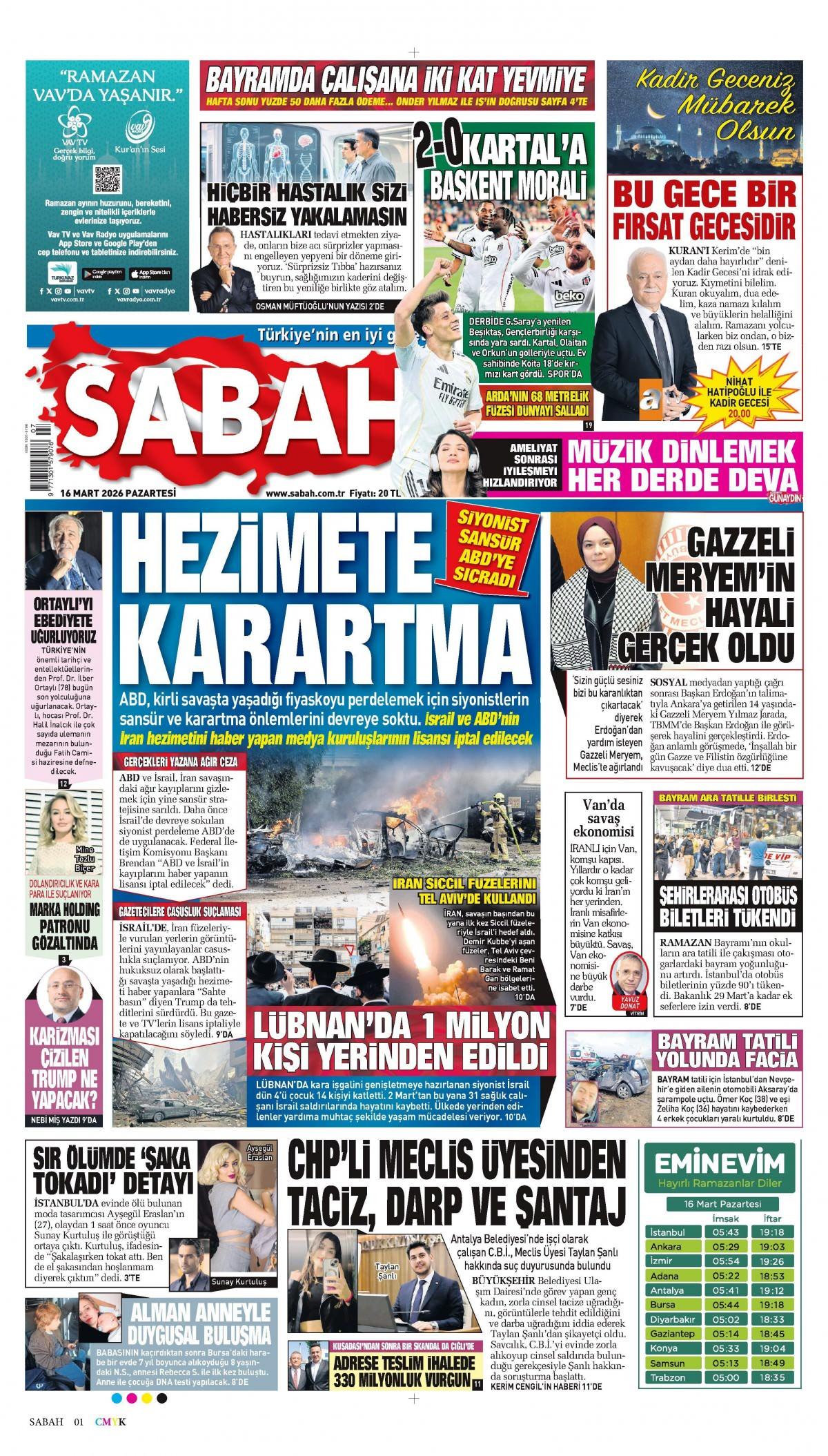 Sabah Gazetesi 17 Mart 2026 Günü Manşeti