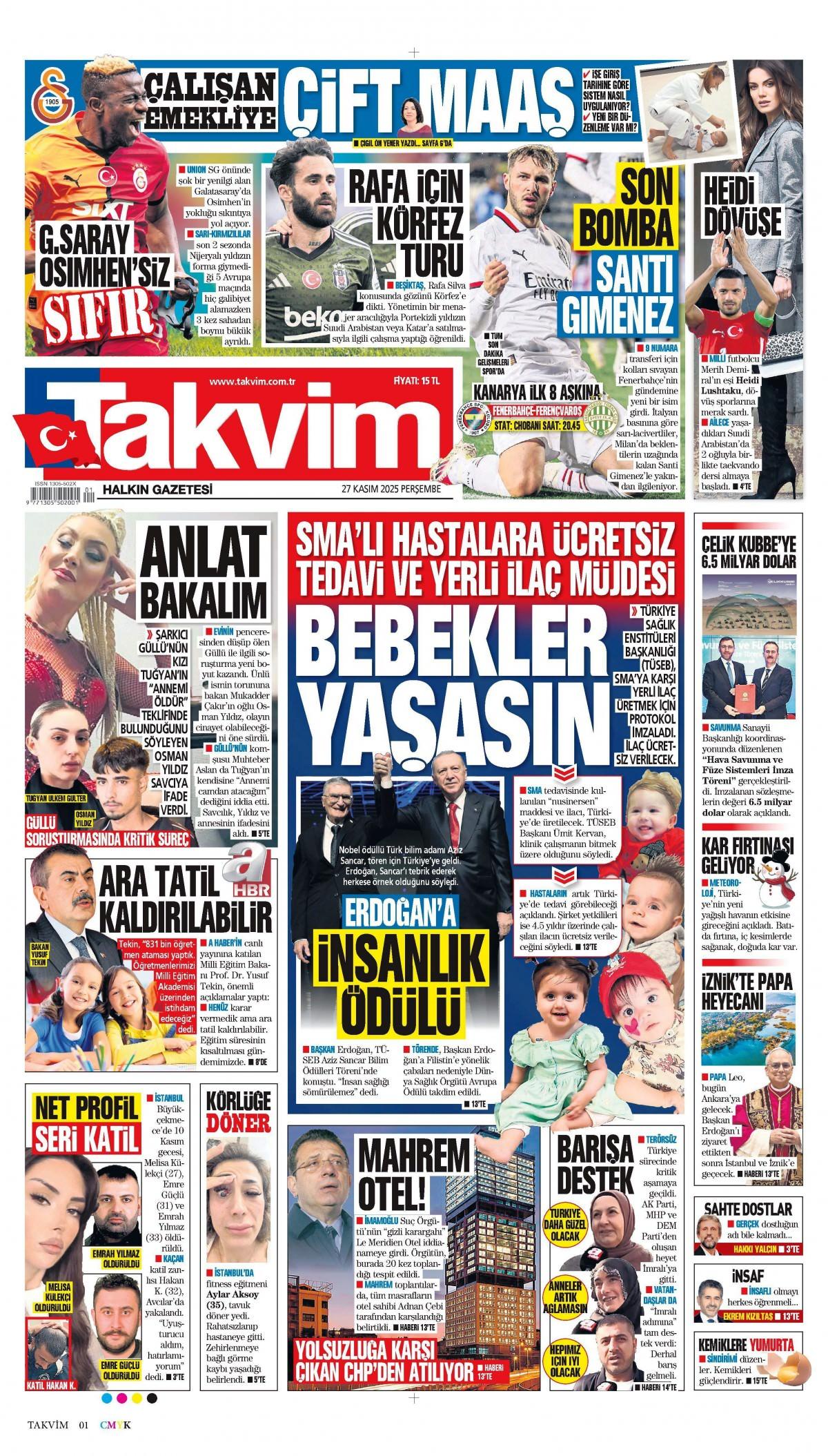 Takvim Gazetesi 28 Kasım 2025 Günü Manşeti